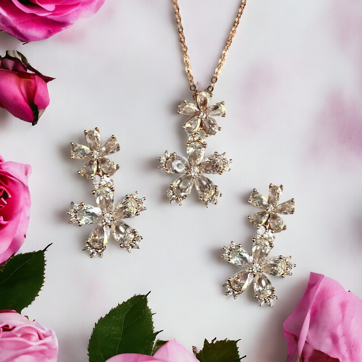 Meet the blooming beauty of this pure 925 silver Flower Drop set that features intricately sculpted translucent petals in full bloom. Wear these rose gold toned beauties with a flowing summer dress and enjoy your romantic garden party!