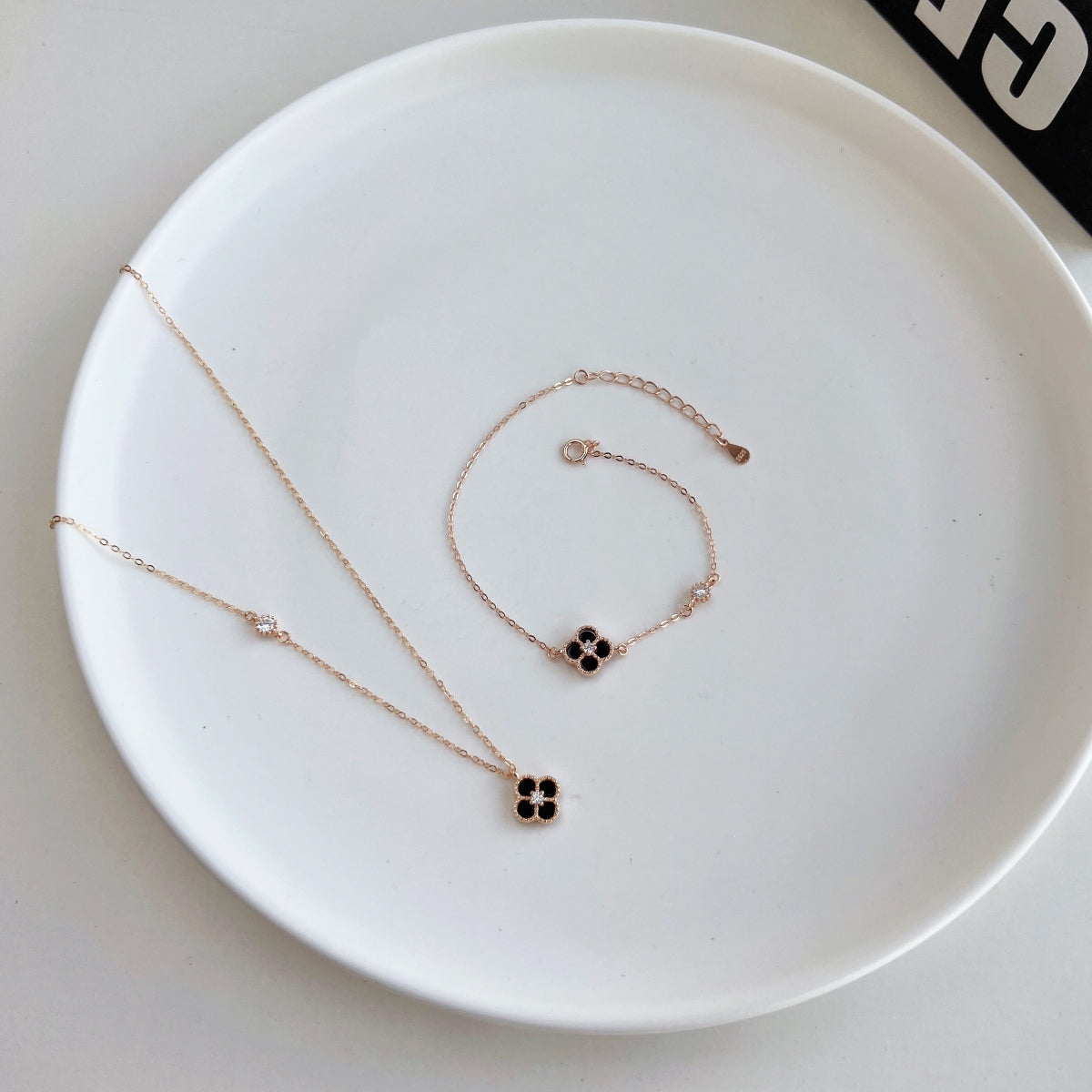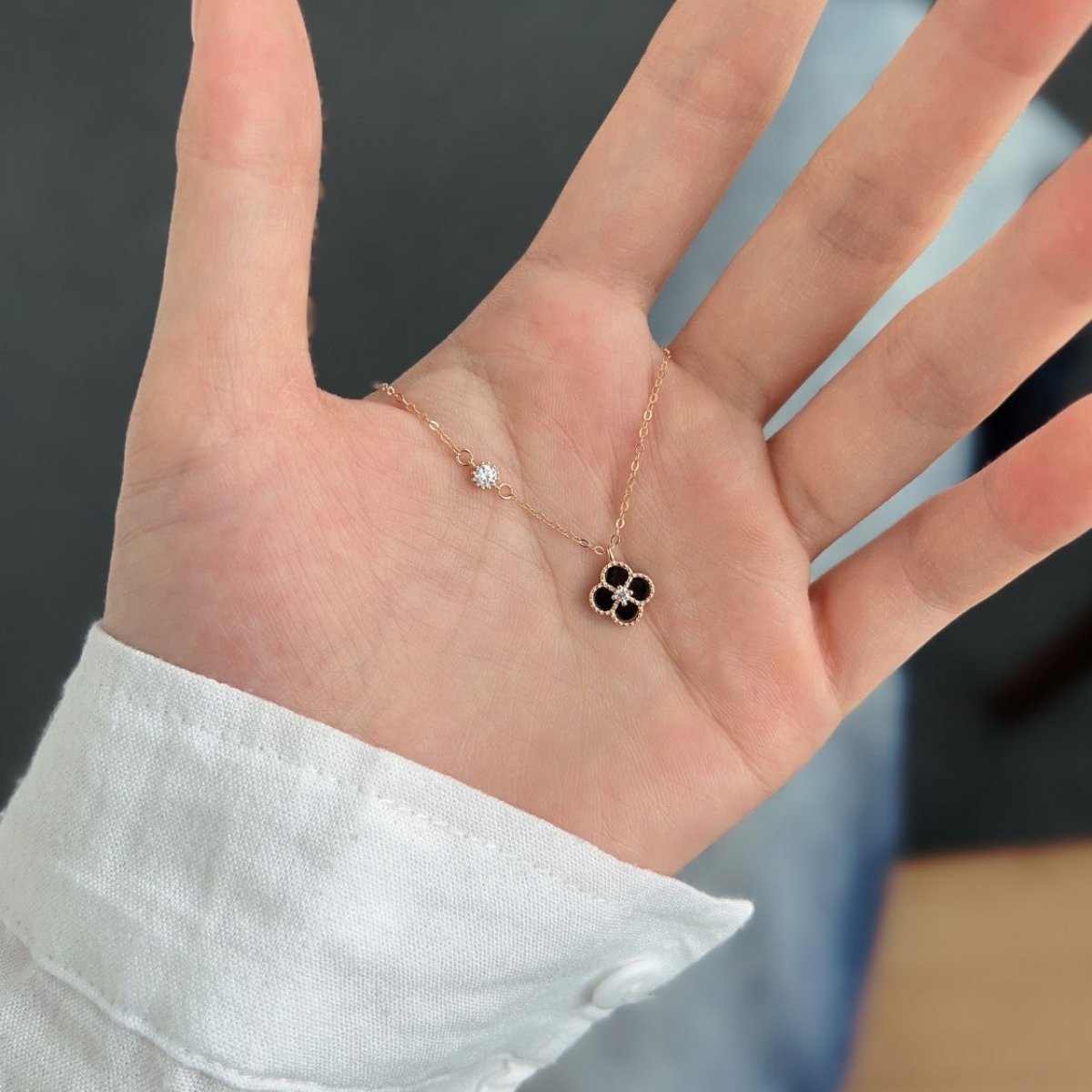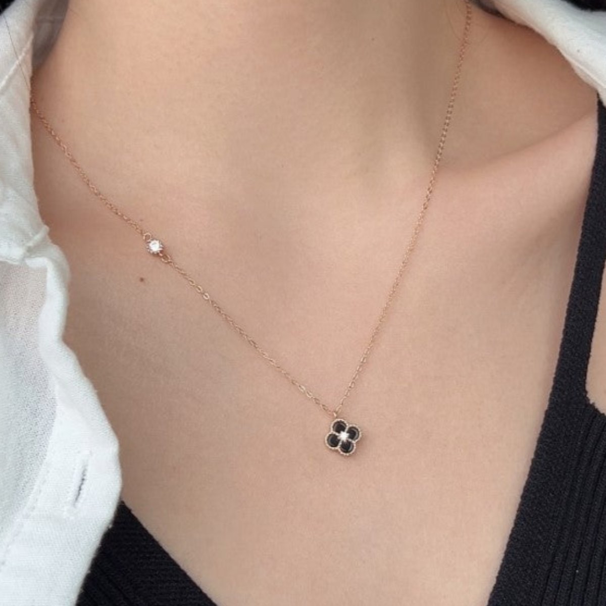Indulge in the mesmerizing elegance of this Black Onyx Clover pendant necklace that contrasts beautifully against the warmth of rose gold plating and can be worn on both sides of the pendant. Wear it simply as a statement of style, as this necklace embodies grace and refinement.