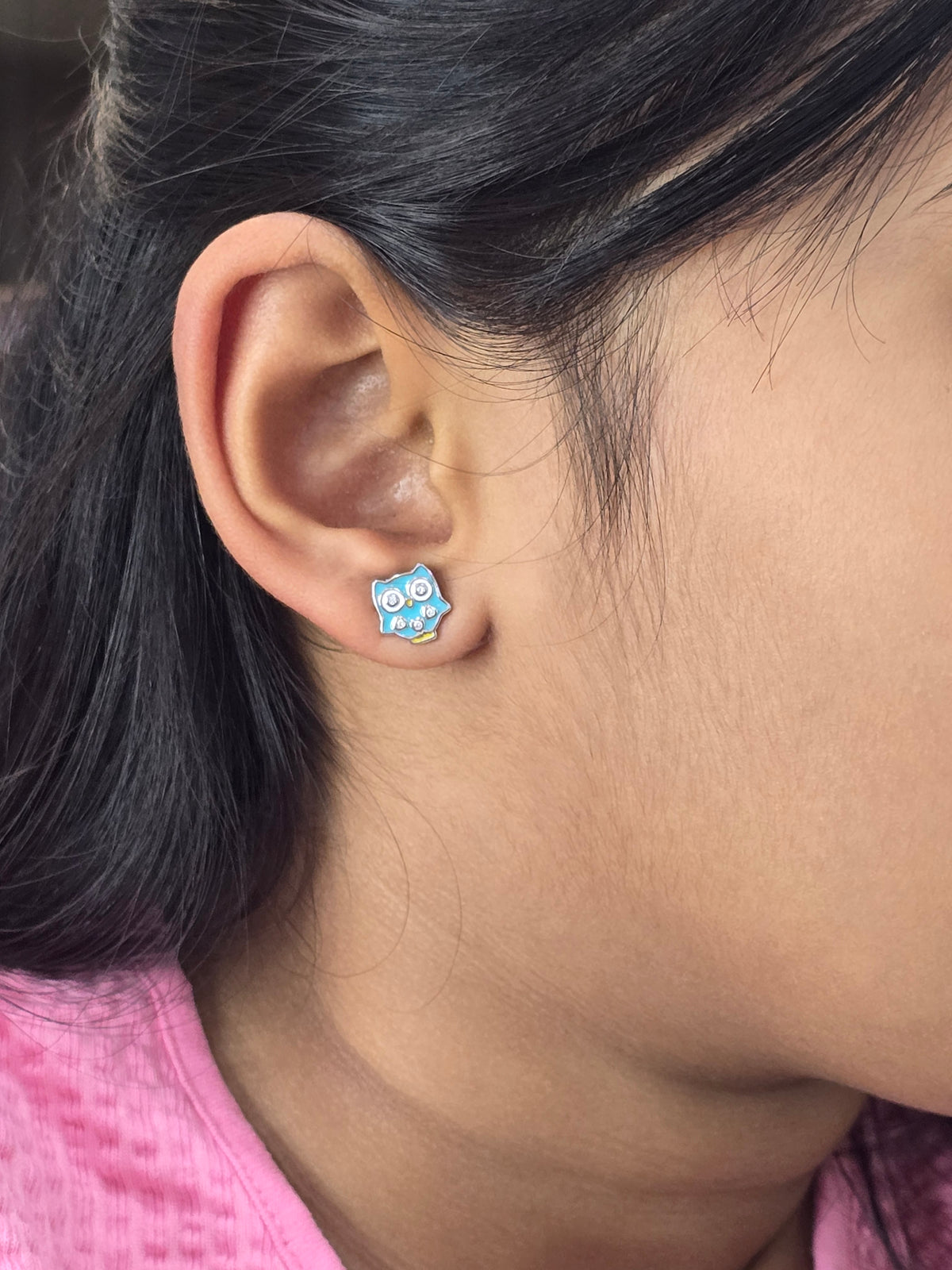 Silver Enamel Cute Owl Kids Earrings - Blue