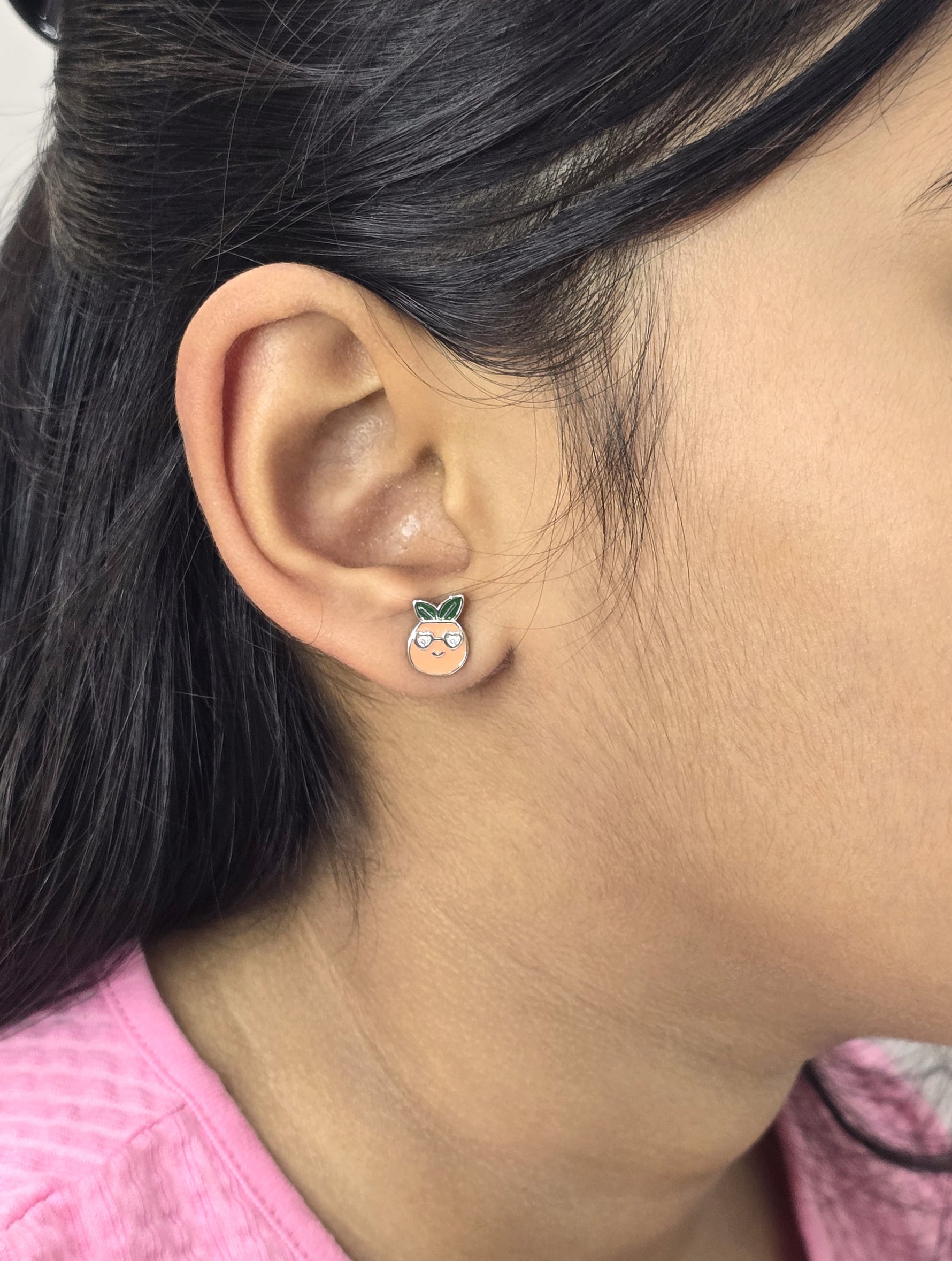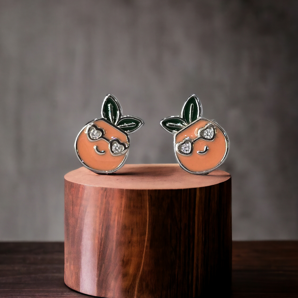 Silver Enamel Happy Apple Kids Earrings - Orange