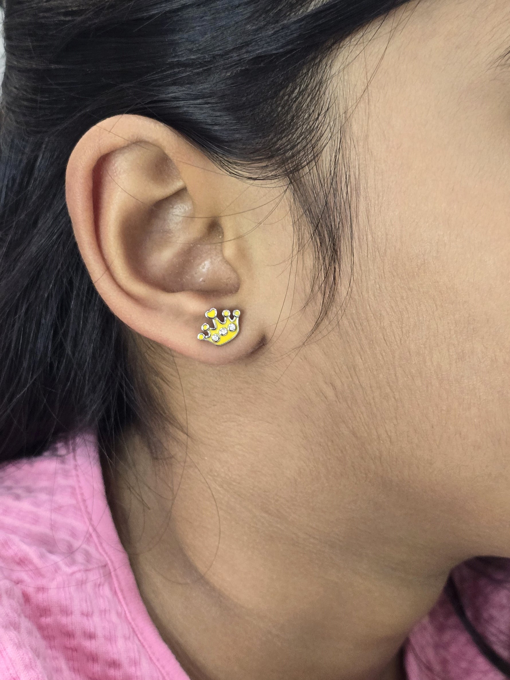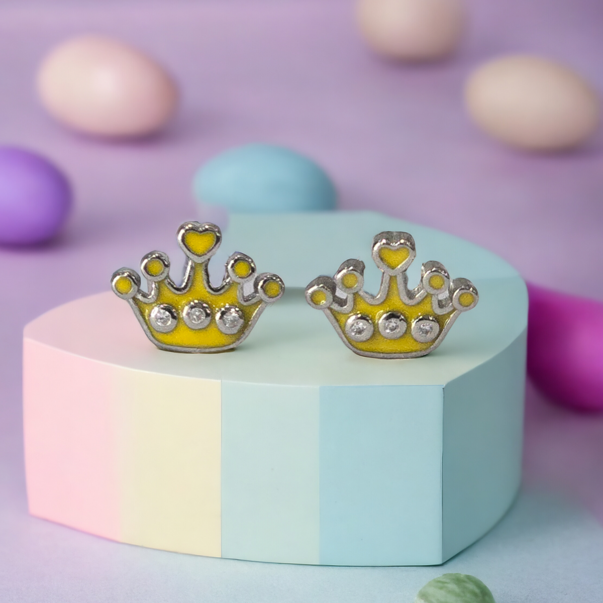 Silver Enamel Heart Crown Kids Earrings - Yellow