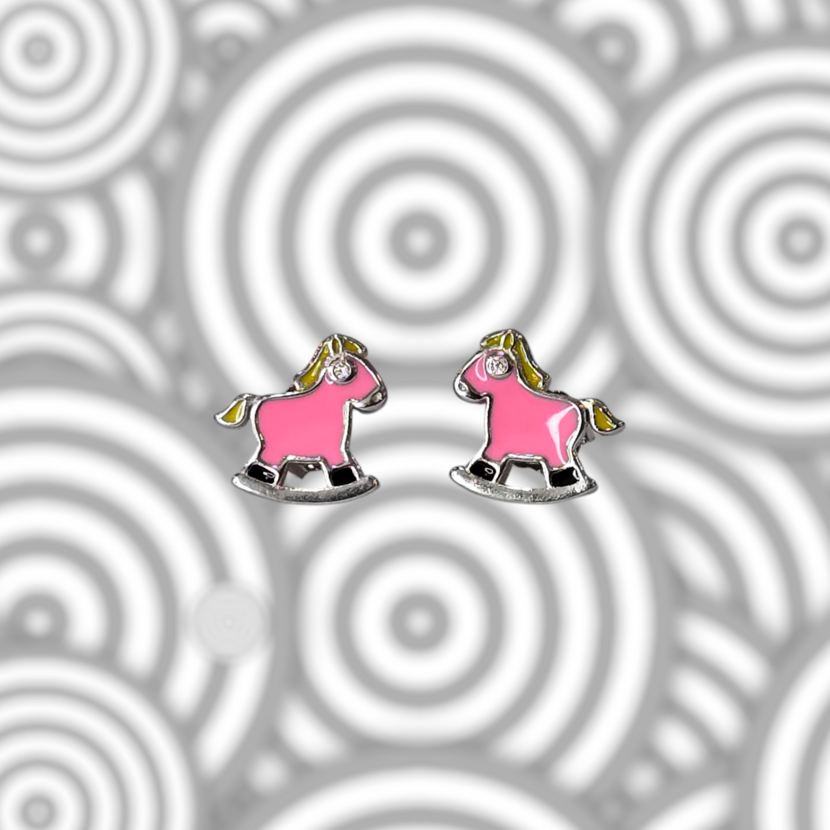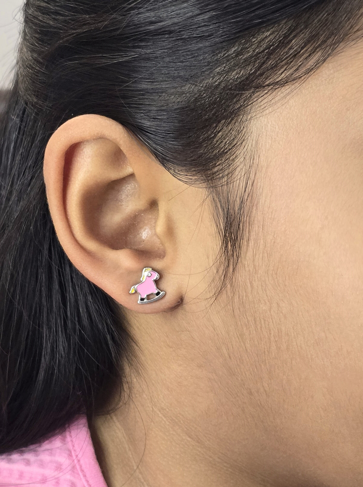 Silver Enamel Rocking Horse Kids Earrings - Pink